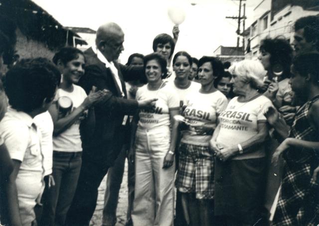 Na imagem temos um grupo de pessoas (quase todas mulheres) conversando com um senhor em trajes formais, que se encontra no centro da foto. A blusa de algumas dessas mulheres esta escrito " Brasil torcida...". - 1978-O Comendador José Bustamante entrega a medalha de Honra ao Mérito para Cidinha (Aparecida Fernandes - ex-funcionária da subprefeitura da Penha) coordenadora da Rua de Lazer que existia na Rua Antonio Lobo, da esquina com a Betari até a esquina com a João Ribeiro. Esta atividade durou por 3 anos, todos os domingos, das 10hoo as 18h00. Havia competição entre moradores de outras ruas de lazer em campeonatos de futebol masculino e feminino e vôlei. O Comendador entregava troféus aos vencedores.