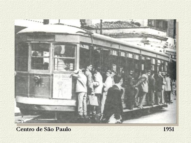 Slide de apresentação do Memorial Penha de França sobre a História do Bonde Paulistano. Na fotografia vemos um bonde aberto da CMTC circulando pelo centro de São Paulo com pessoas dentro. Na frente vemos o número "1117" e um cartaz com uma propaganda do "Brio Coringa".