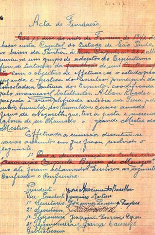 Na fotografia vemos o documento de fundação da instituição, que tinha como objetivo de propagar e difundir o kardecismo. Nele também ficou decidido que o centro se chamaria "associação espírita Bezerra de Menezes" e assinam o documento o presidente, José Nascimento Bacellar, o vice, Joaquim Martins, o 1º secretário: Joaquim Lourenço Lopes, o 2º secretário:----, o 1º tesoureiro: Joaquim Lourenço Lopes, 2º tesoureiro: Luiz França Camargo.
