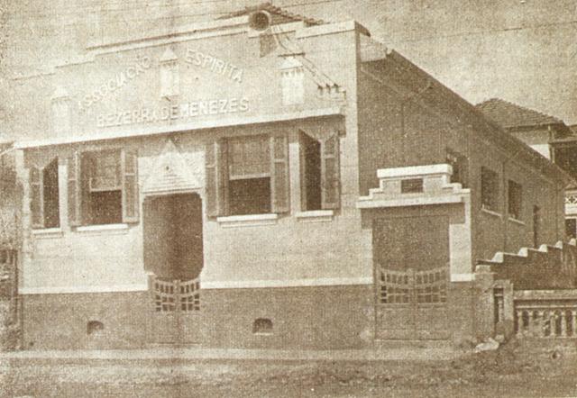 Na fotografia vemos uma antiga fachada da associação espírita bezerra de Menezes. Um grande edifício simétrico em sua arquitetura. Em sua fachada vemos em letras grandes o nome da instituição e um desenho de um retângulo em pé com um triângulo na ponta. Esse desenho está reproduzido abaixo, no design da porta de acesso principal, que tem uma pequeno portão de mandeira na entrada. As janelas, também obdecem a uma simetria que vai das menores as maiores, olhando a fachada das extremidades ao centro. Do lado direito da foto vemos uma entrada lateral que reproduz em tamanho menor, a arquitetura da fachada superior. Ao fundo vemos a extensão do edifício e mais três janelas laterais.