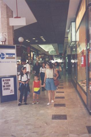 Registro de um dos corredores do Shopping Penha. Algumas pessoas passsam pelo local. Em primeiro plano, vemos uma mulher com duas crianças. Nas laterais do corredor, vemos vitrines das lojas. À esquerda, há um banner da Visa, com a frase "Um pequeno detalhe. Uma grande diferença." À direita, vemos um extintor de incêndio.