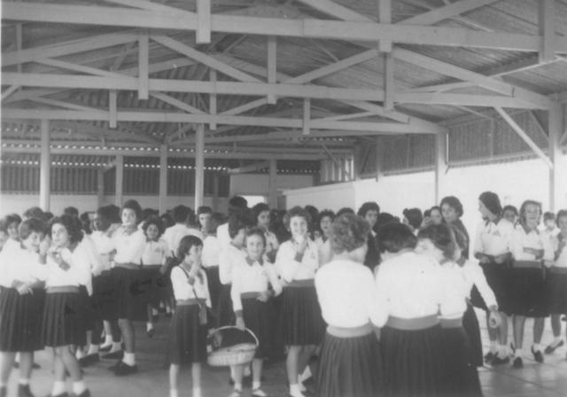 Alunas do então Externato São Vicente de Paulo no pátio superior da escola. As alunas estão uniformizadas, usando saia plisada e camisetas de manga comprida com gola. Podemos observar a estrutura do teto do local, formado por vigas de madeira e telhas. A foto foi intitulada como "recreio". Podemos observar que várias alunas estão comendo algo. Uma delas, no centro da foto, está segurando uma cesta.