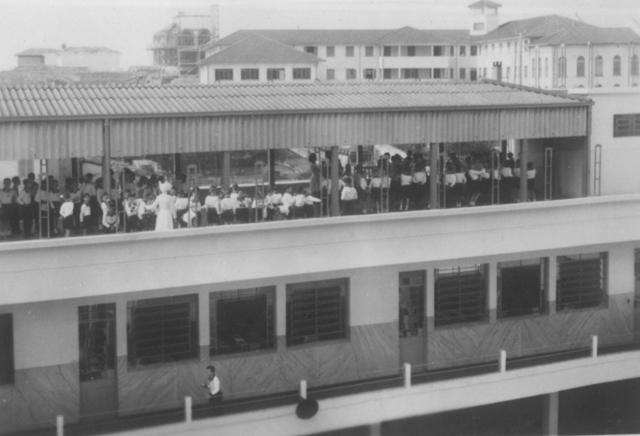 Foto do pátio superior do então Externato São Vicente de Paulo, onde vemos diversos alunos. Os alunos estão uniformizados e algumas mulheres adultas estão com eles; à esquerda, vemos uma freira usando hábito e corneta. O pátio possui as laterais envoltas de rede, e é coberto por telhas. No andas de baixo, vemos portas e janelas da salas de aula, e um aluno passando pelo corredor externo. Ao fundo, vemos o prédio do então Seminário da Penha, e atrás dele, a Basílica Nossa Senhora da Penha ainda em construção.
