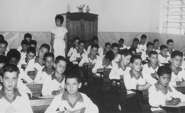 Turma do 4º ano masculino do então Externato São Vicente de Paula. Os alunos estão com o uniforme da escola - camiseta de manga longa e gola. Eles estão com canetas nas mãos; alguns estão olhando para câmera, enquanto outros olham para o caderno. Em pé ao fundo da sala, está a professora Dona Isabel. Ao lado dela há um armário de madeira, com duas imagens de santas e um vasinho em cima. Na parte inferior das paredes, vemos um revistimento de pedra ou azulejo. No canto direito, vemos parte de uma janela.